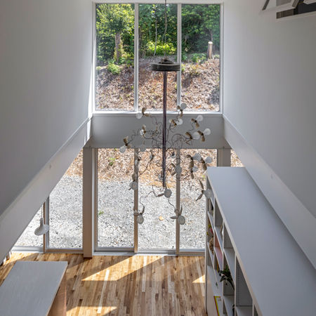 南に大きな高低差があり、その上にアパートが建つ事から緑が広がる東面に大開口を配置。
